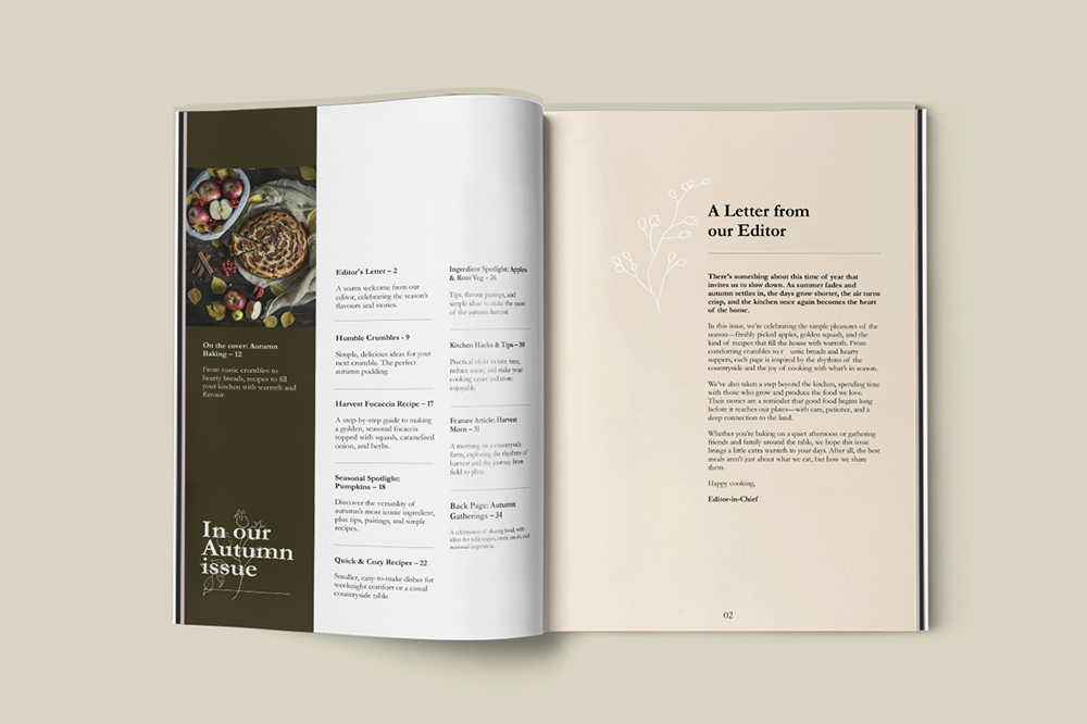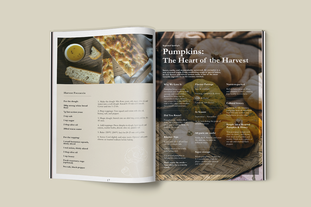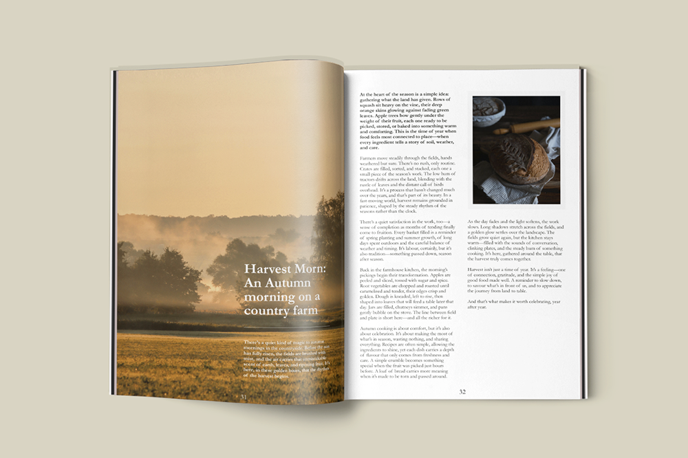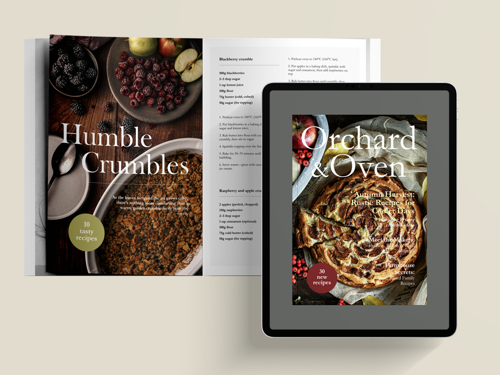 Orchard & Oven is a rustic country food magazine that celebrates slow living, seasonal produce, and the stories rooted in the land. This was an editorial and brand identity project to develop a cohesive visual language across both print and digital magazine formats.