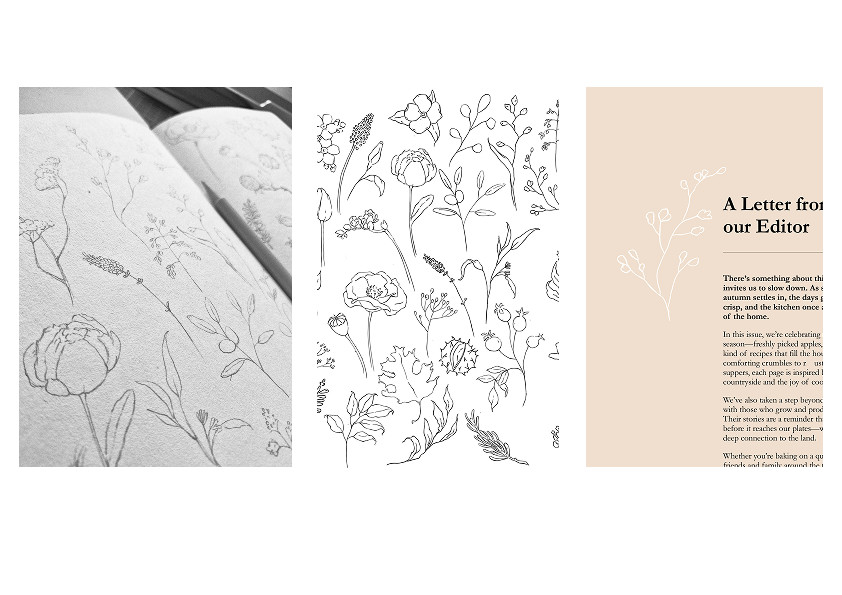 To reinforce the organic aesthetic, I introduced hand-drawn illustrations as a subtle decorative element. These began as hand-sketched wildflowers and foliage, which were then refined digitally in Procreate. The illustrations are used throughout the magazine in varied colours, adding gentle visual interest while maintaining a minimal, cohesive feel.