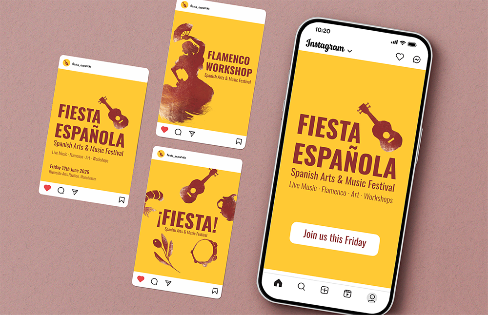 The project includes a festival poster, event programme, and a set of social media graphics designed to create a cohesive promotional campaign. Bold typography, vibrant colours, and hand-drawn graphic elements were used to capture the movement and atmosphere of the festival while ensuring clarity across both print and digital formats.